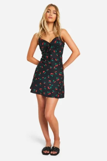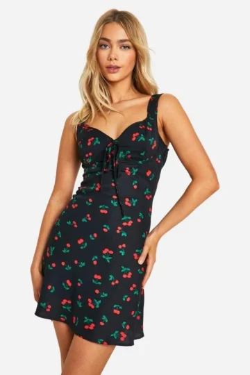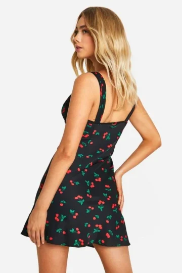 BOOHOO Cherry Print Satin Slip Mini Dress