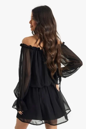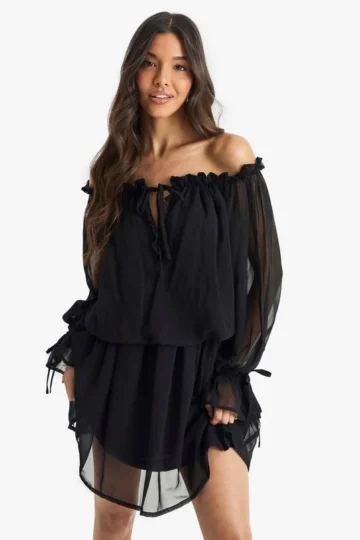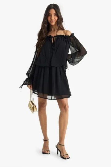 BOOHOO Chiffon Bardot Dropped Waist Mini Dress