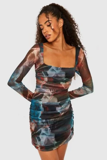BOOHOO Abstract Square Neck Ruched Mesh Bodycon Dress