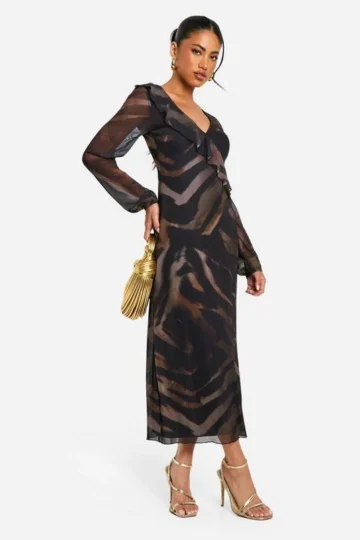 BOOHOO Animal Mesh Ruffle Midi Dress