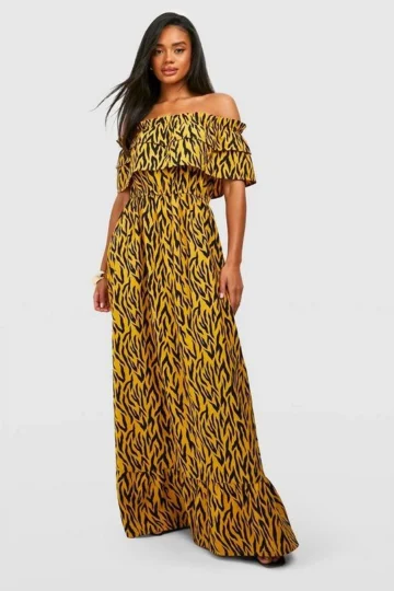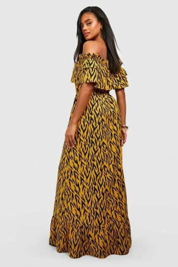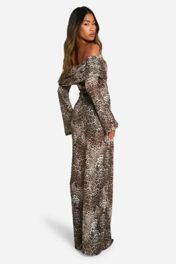 BOOHOO Animal Print Off The Shoulder Ruffle Maxi Dress