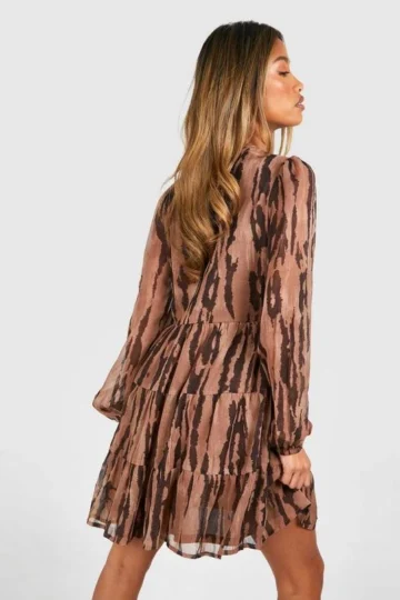 BOOHOO Animal Print Tiered Chiffon Smock Dress