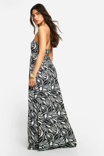 BOOHOO Bandeau Leaf Print Linen Look Maxi Dress
