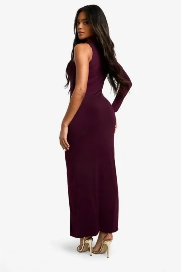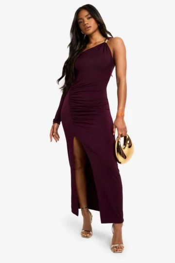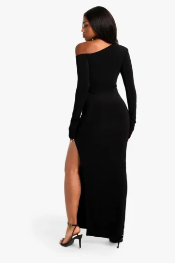 BOOHOO Asymmetric Shoulder Pad Slinky Split Maxi Dress