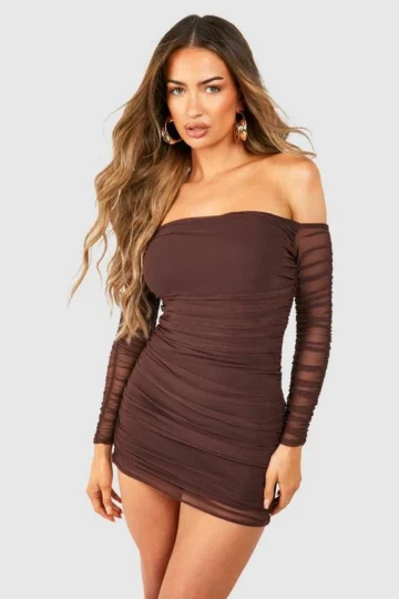 BOOHOO Bardot Ruched Mesh Mini Dress