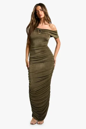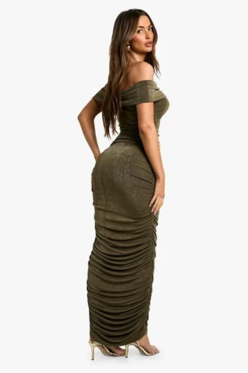 BOOHOO Bardot Trim Detail Ruched Slinky Maxi Dress