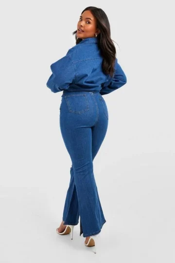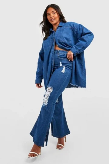 BOOHOO Plus Mid Wash High Waisted Split Detail Flare Jeans