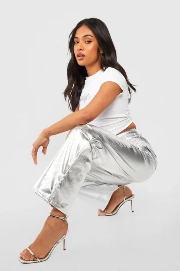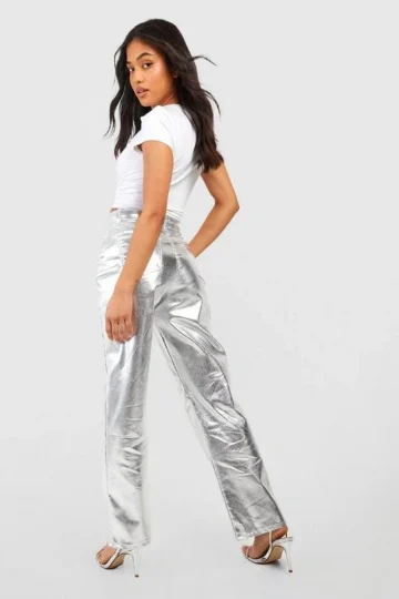 BOOHOO Petite High Rise Metallic Silver Pu Coated Straight Leg Jean