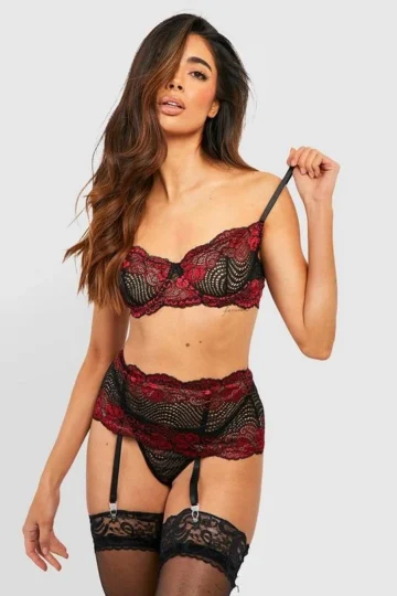BOOHOO Lace Bra & Suspender Set And Thong