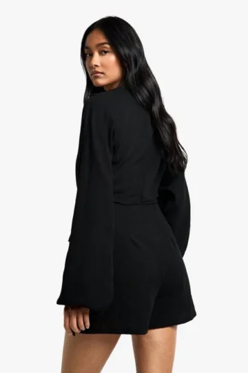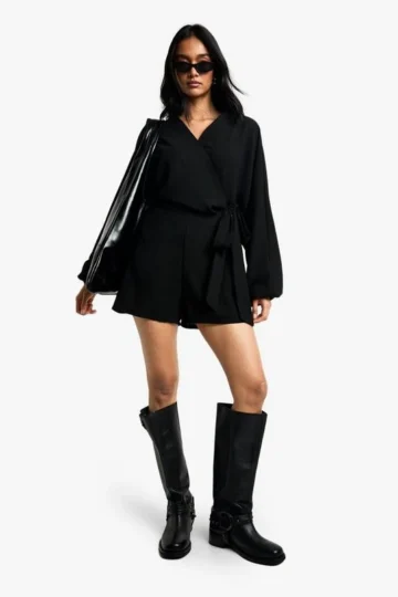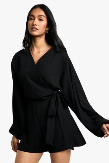 BOOHOO Linen Look Wrap Over Tie Detail Playsuit
