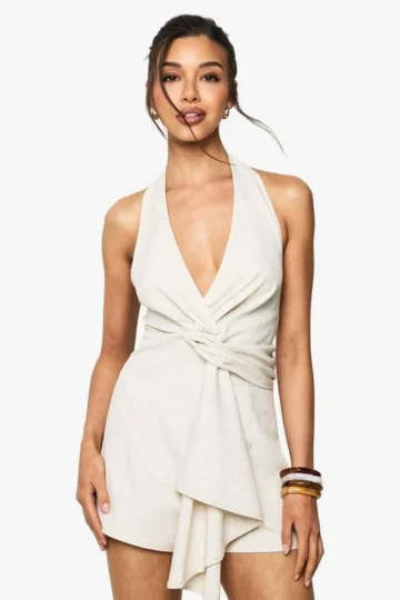 BOOHOO Linen Look Twist Neck Halterneck Playsuit