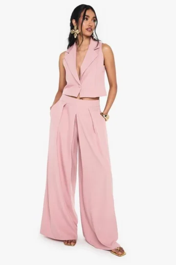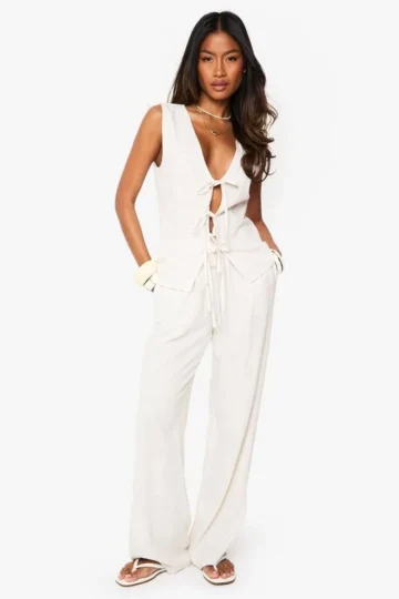 BOOHOO Linen Look Pleat Front Wide Leg Tailored Trousers