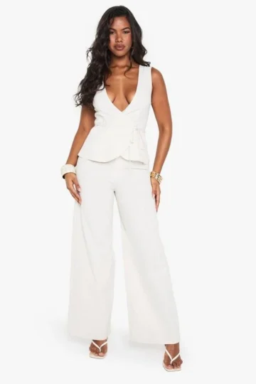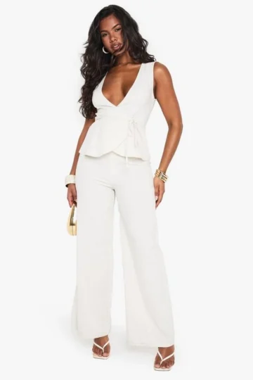 BOOHOO Linen Look Wide Leg Plunge Jumpsuit