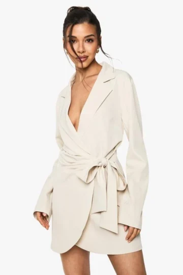 BOOHOO Linen Look Wrap Drape Front Tailored Blazer Dress