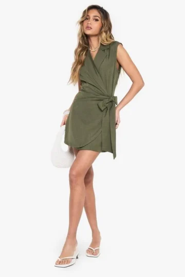 BOOHOO Linen Look Wrap Drape Front Sleeveless Blazer Dress