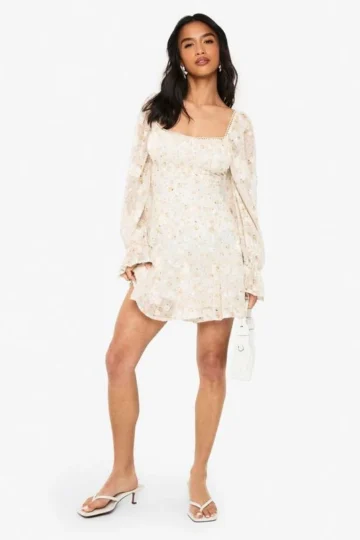 BOOHOO Petite Chiffon Jaquard Floral Angel Sleeve Mini Dress