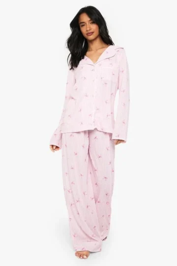 BOOHOO Petite Bow Contrast Piping Shirt & Trouser Pyjama Set