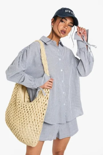 BOOHOO Crinkle Stripe Tie Cuff Shirt And Short Co-ord