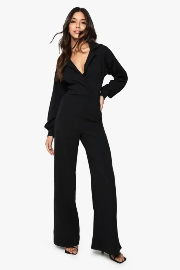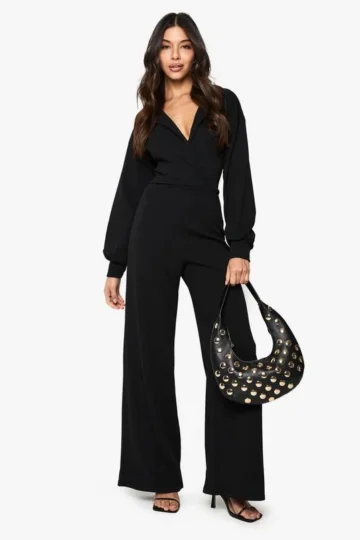 BOOHOO Crepe Volume Sleeve Wrap Front Wide Leg Jumpsuit
