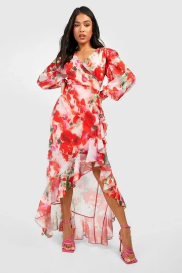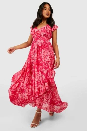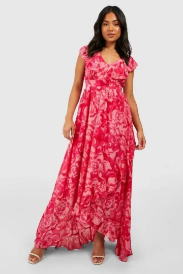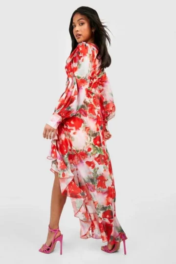 BOOHOO Petite Chiffon Floral Wrap Ruffle Maxi Dress