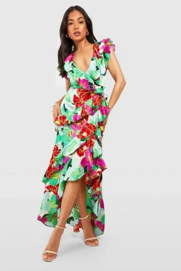 BOOHOO Petite Floral Wrap Ruffle Maxi Dress