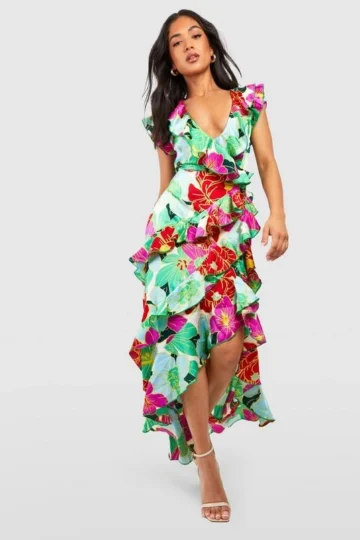 BOOHOO Petite Floral Satin Occasion Frill Maxi Dress