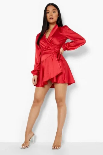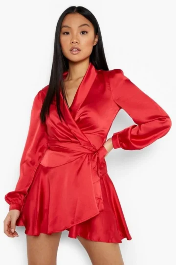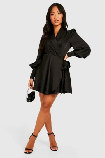 BOOHOO Petite Premium Satin Wrap Skater Dress