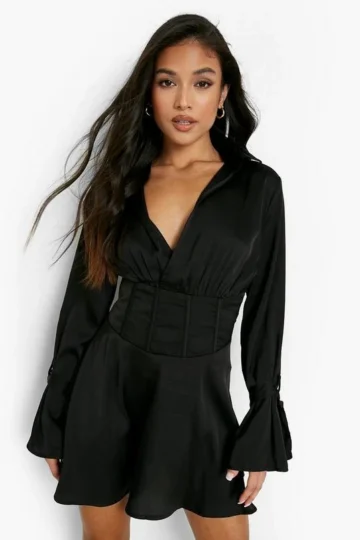 BOOHOO Petite Satin Tie Cuff Corset Skater Dress