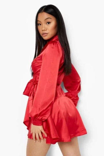 BOOHOO Petite Satin Wrap Detail Mini Skater Dress