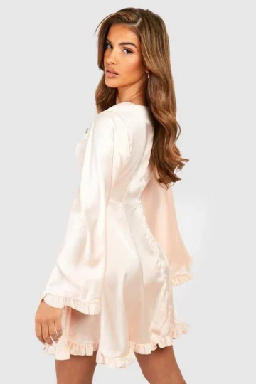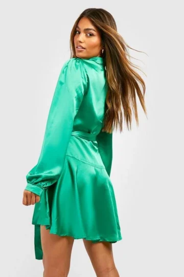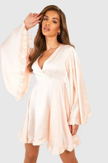 BOOHOO Satin Wide Sleeve Wrap Skater Dress