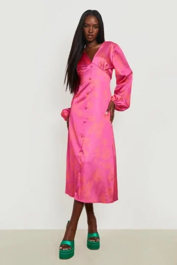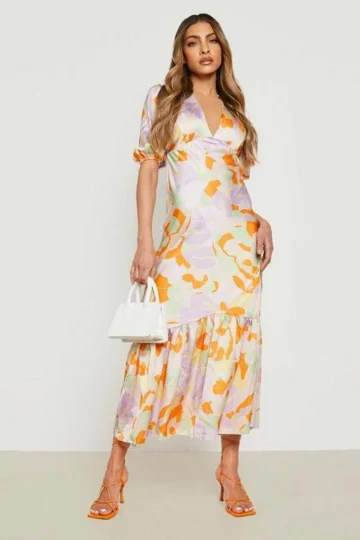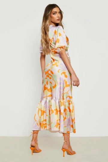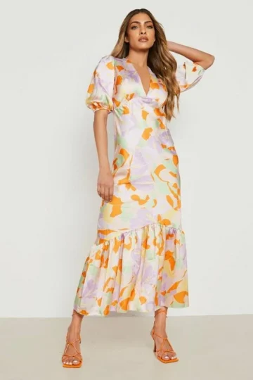 BOOHOO Floral Puff Sleeve Drop Hem Midi Dress