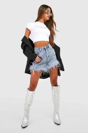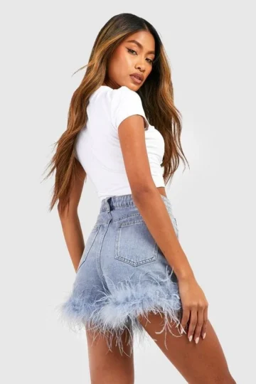 BOOHOO Feather Hem High Waisted Jean Shorts
