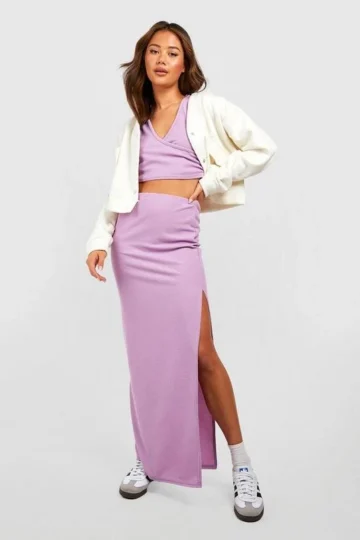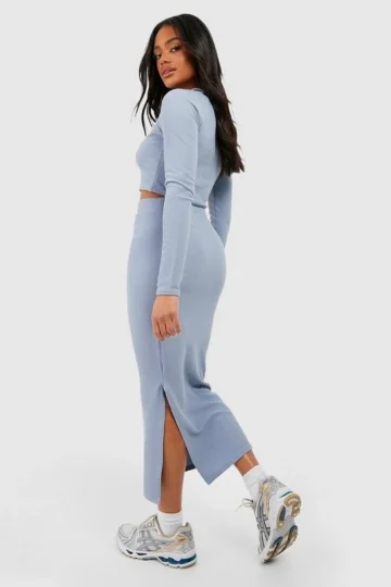 BOOHOO Ribbed Bodycon Thigh Split Maxi Skirt