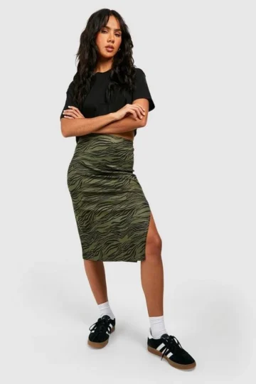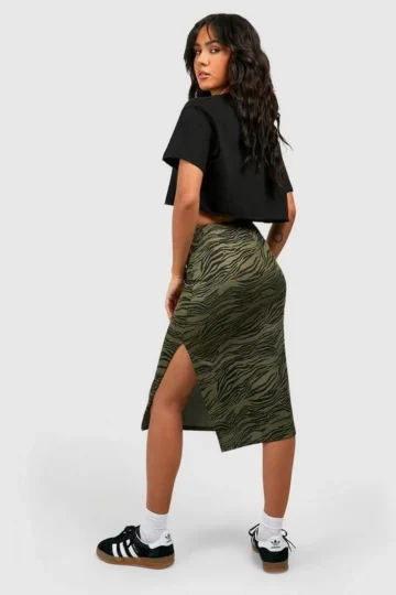 BOOHOO Zebra Print Rib Side Split Midi Skirt