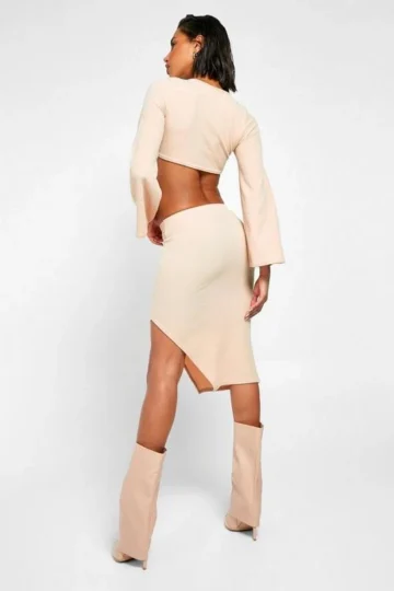 BOOHOO Crinkle Rib Side Split Midi Skirt