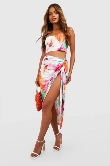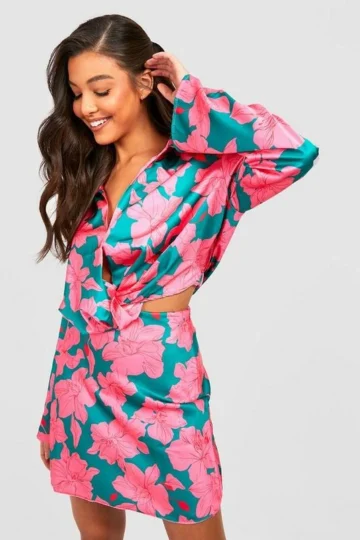 BOOHOO Floral Satin Drape Front Shirt & Mini Skirt