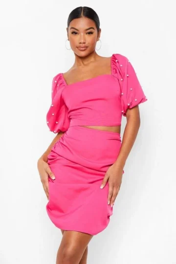 BOOHOO Pearl Sleeve Top And Ruched Skirt Two-Piece Set