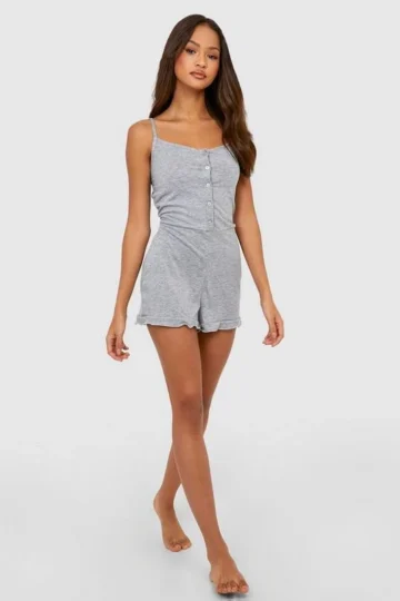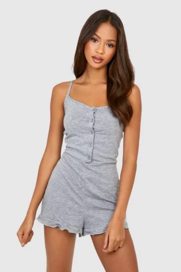 BOOHOO Jersey Knit Button Up Frill Hem Romper
