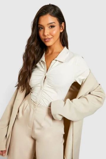 BOOHOO Ruched Fitted Jersey Knit Collared Shirt