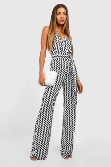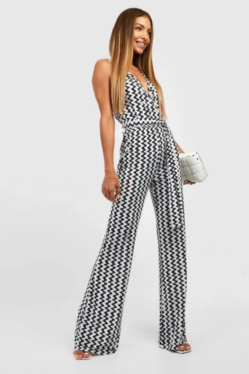 BOOHOO Slinky Wave Print Wrap Jumpsuit