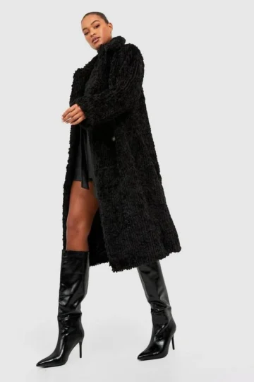 BOOHOO Tall Textured Faux Fur Double Breasted Coat