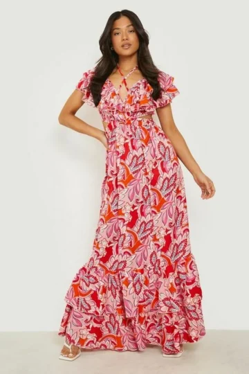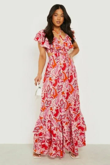 BOOHOO Petite Paisley Ruffle Tie Back Maxi Dress