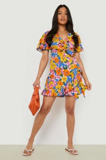 BOOHOO Petite Floral Ruffle Wrap Dress