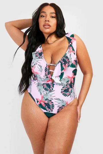 BOOHOO Plus Tropical Ruffle Plunge Swimsuit