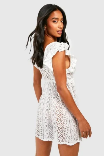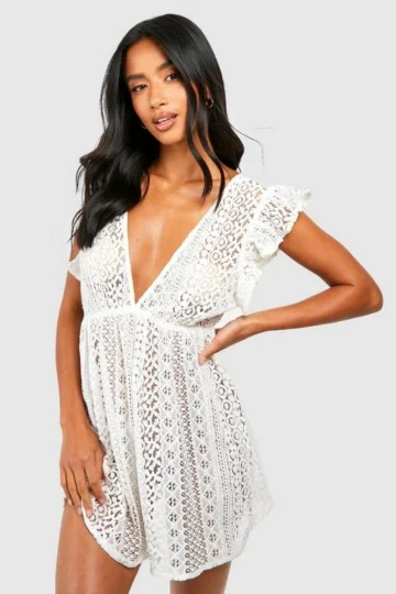 BOOHOO Petite Ruffle Lace Plunge Beach Mini Dress
