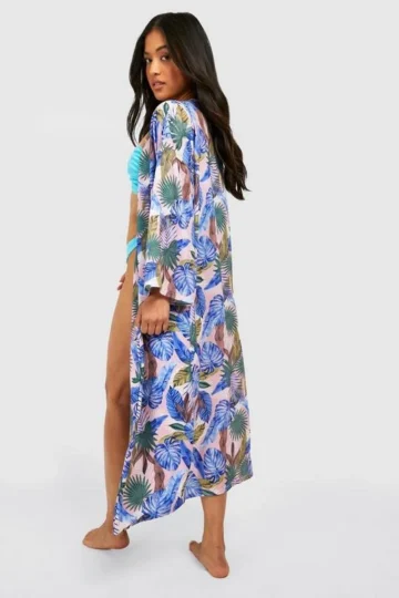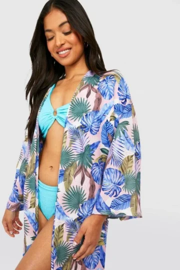 BOOHOO Petite Palm Print Chiffon Beach Kimono