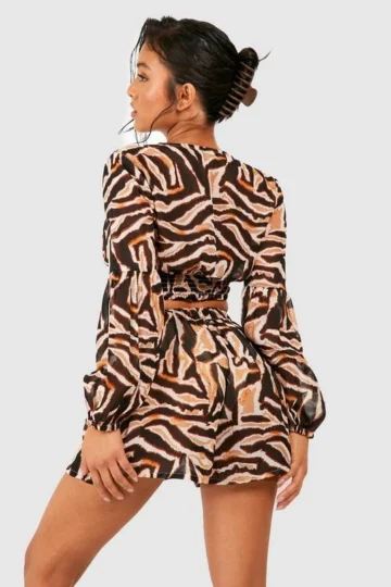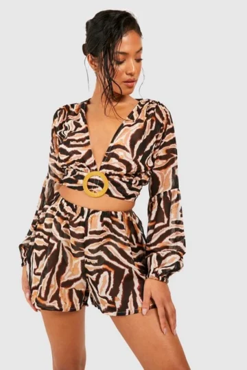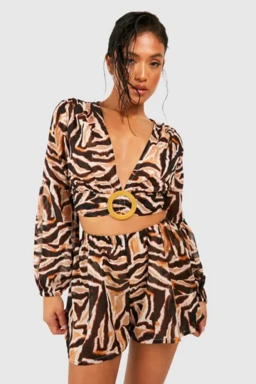 BOOHOO Petite Tiger Print Buckle Top & Short Two-Piece