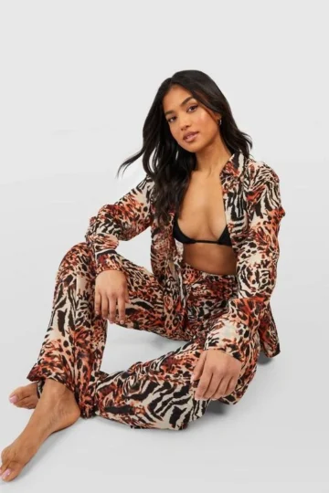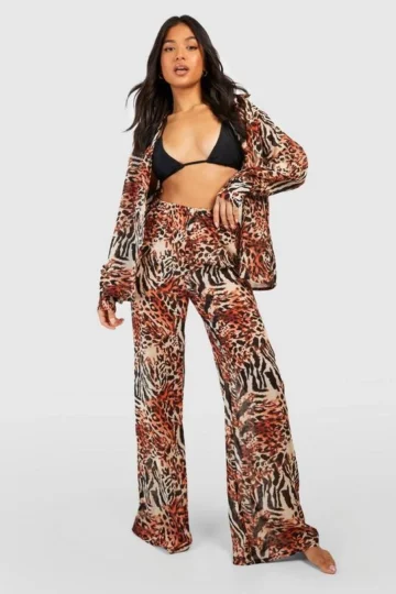 BOOHOO Petite Mixed Animal Beach Chiffon Shirt & Pants