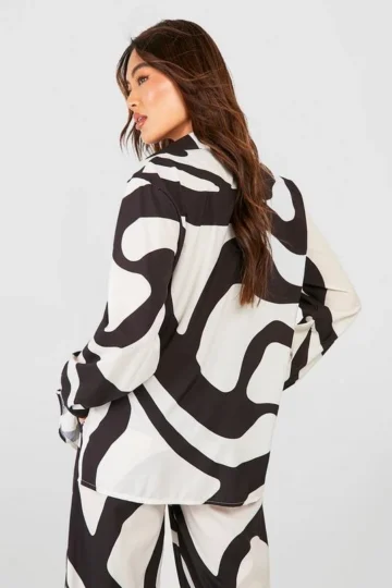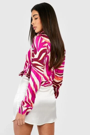BOOHOO Abstract Satin Fitted Shoulder Pad Shirt