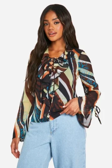 BOOHOO Abstract Chiffon Ruffle Blouse